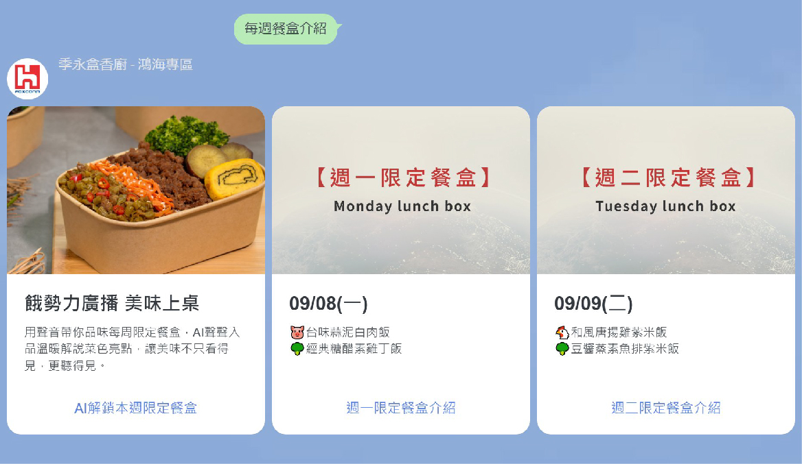 用聲音帶你品味每週限定餐盒,AI聲聲入品溫暖解說菜色亮點,讓美味不只看得見,更聽得見。